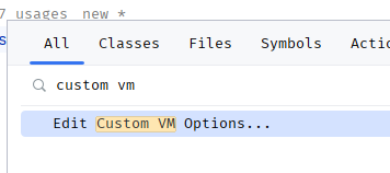 Shift 키를 두 번 눌러주면 빠른 실행 창이 나오는데, 거기서 custom vm 이라고 검색해줍시다.