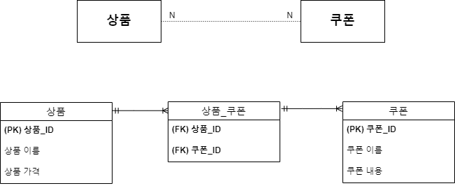 (위 그림처럼 상품 엔티티와 쿠폰 엔티티는 상품_쿠폰 엔티티라는 관계 엔티티로 다대다 관계가 맺어집니다.)